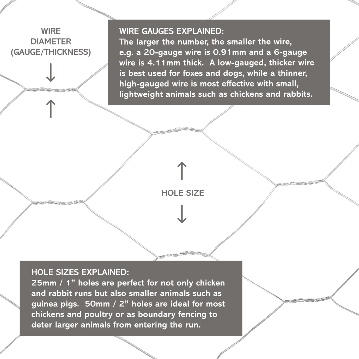 Our chicken wire is supplied in two different wire gauges 20 and 22 gauge, this means the wire is 0.9mm and 0.7mm thick, which is the standard for most chicken wire. We do also have some slightly heavier gauged wire in our largest 1.8m high rolls, this wire is 19 gauge (1mm) thick.