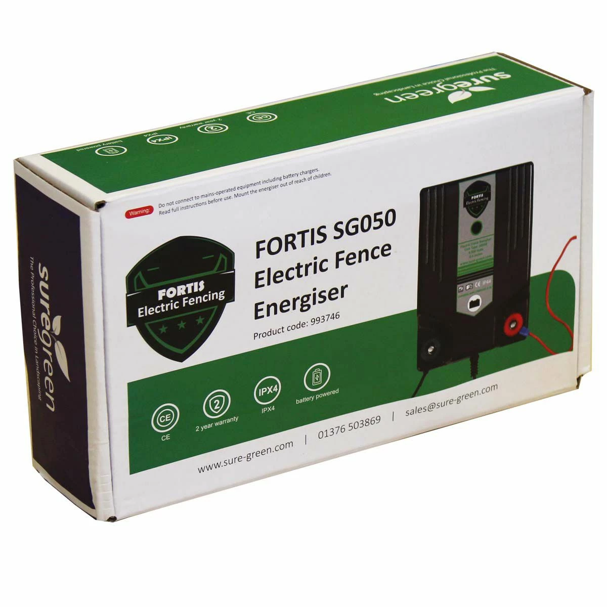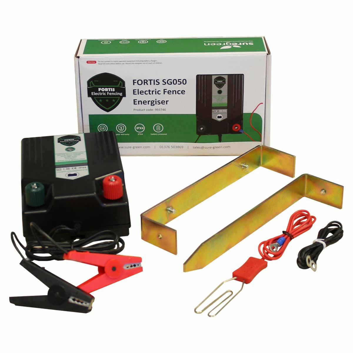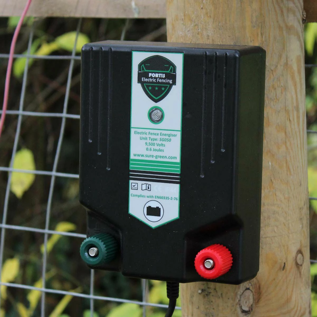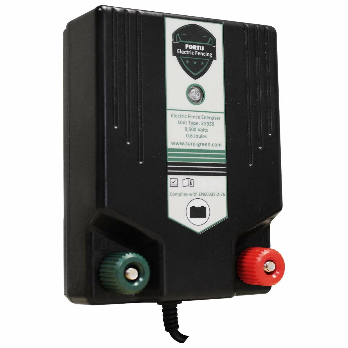 Our Fortis SG050 energiser model is a robust and affordable model that you can depend on. It is an effective powered electric fence energiser which supports a 12V leisure wet battery and 9V dry battery and will have an output voltage of 9,500V. It is mainly used for enclosing livestock and keeping out any pests/predators out of animal enclosures.