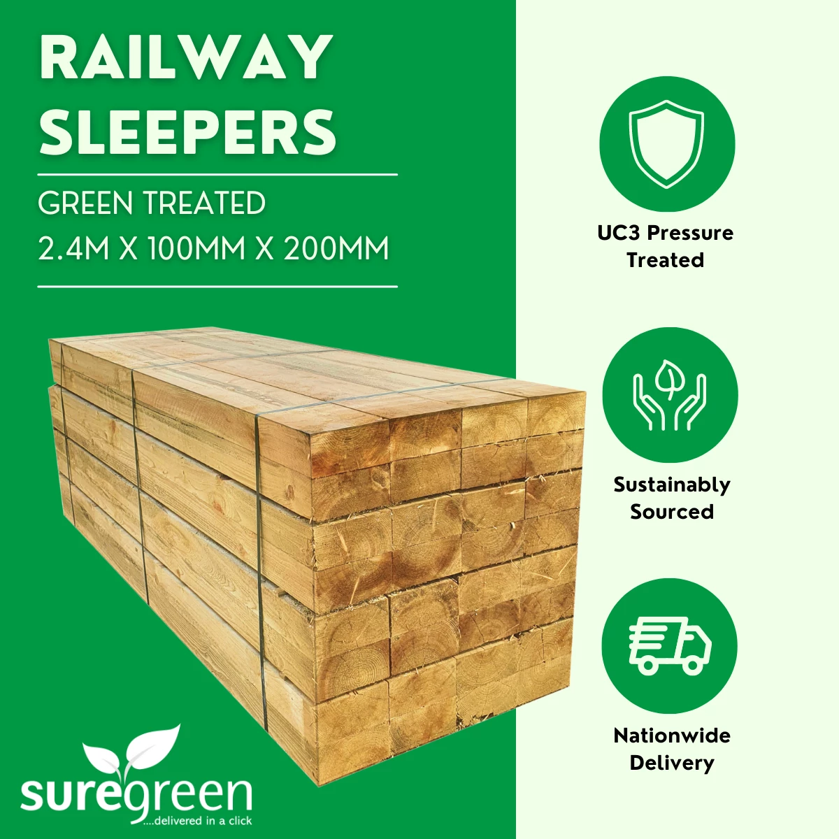 - High-quality 2.4m railway sleepers made from softwood timber