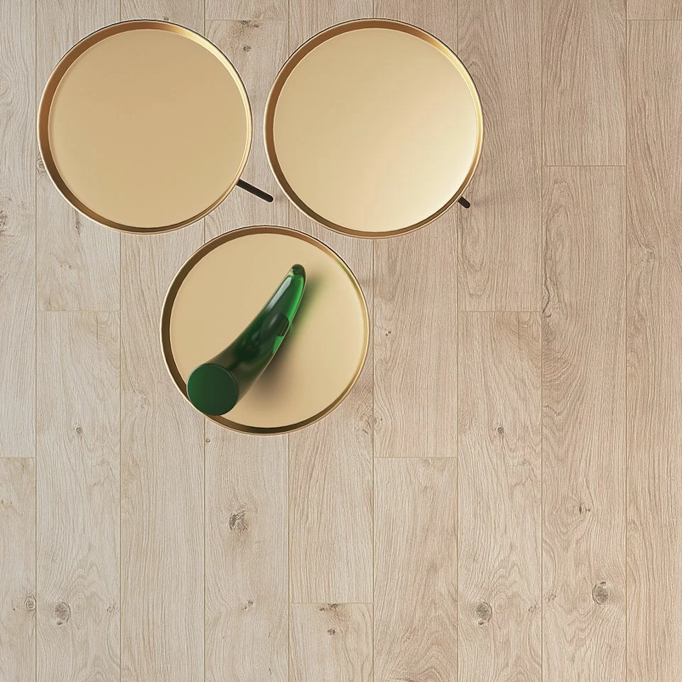 - This decor has an oak look in a natural colour.